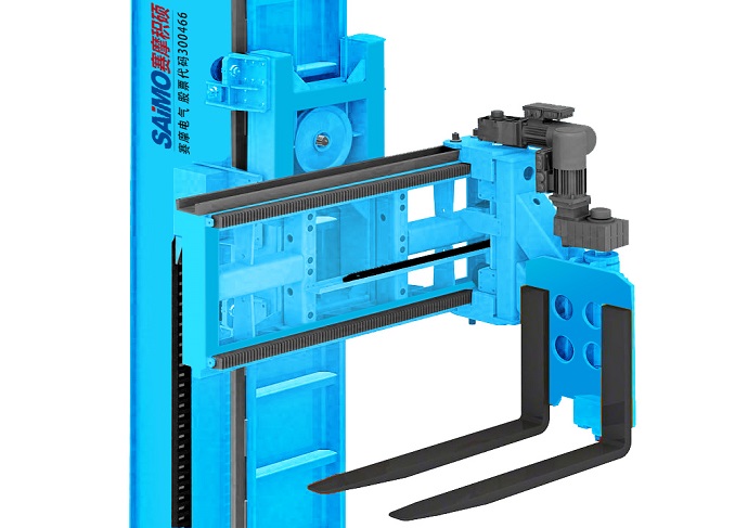 三向堆垛机货叉在上升或下降时,可以在左、前、右三个方向进行堆垛作业的特殊属具。它与货叉整合为一体,可以携带货叉进行180度水平旋转和横向侧移,可直接横向叉取货物,实现叉车在窄通道内搬运和堆垛货物的能力,密集存储,仓库扩容首选。