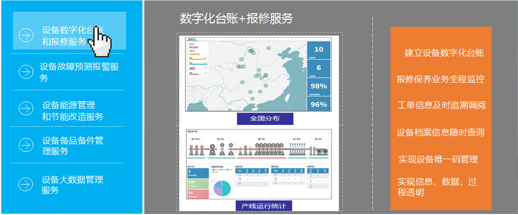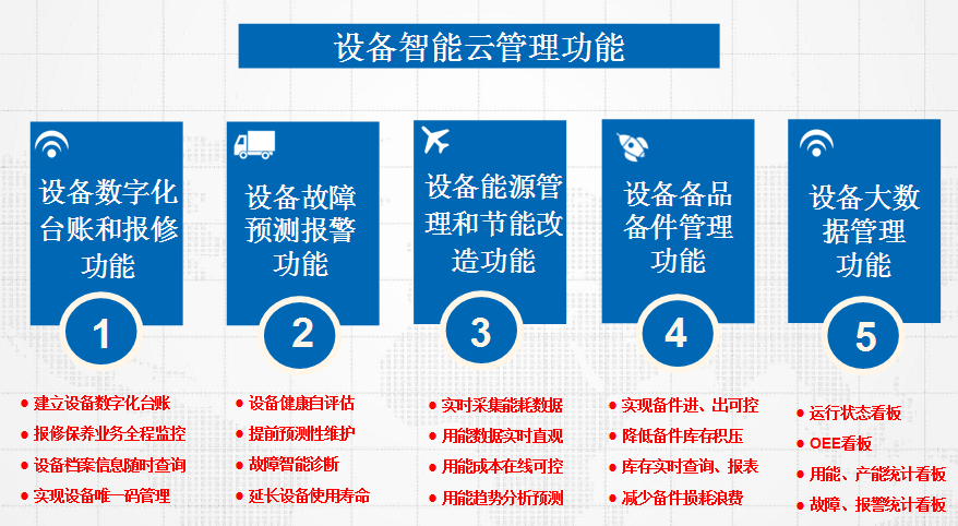 生产设备管理云平台解决了企业对设备开关状态、运行数据、能源消耗、备件更维、故障维护的功能需求,是设备智能管理的基础和首要环节,能够有效减少设备故障率和备件更换率,延长设备使用寿命,是可见可实的降本增降有效手段。