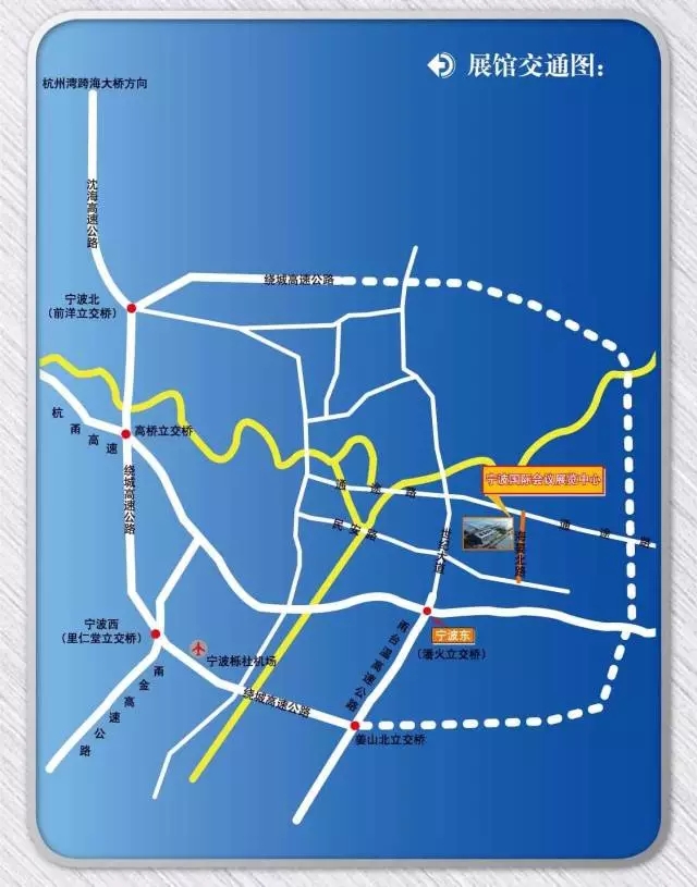 甬台温高速宁波东出口下高速沿世纪大道直行约4公里至民安东路右转约300米第一个红绿灯路口左转进入海晏北路直行300米至会展中心。