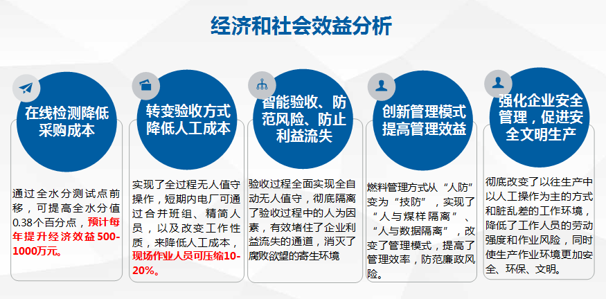 项目实施后,可大幅提高燃料入厂煤采制样、验收工作的及时性和准确性,能够最大程度的减少样品的水分损失,每年可提升经济效益500-1000万元,项目取代了低效率的人工劳动,减少工作时间,降低劳动强度,可压缩10-20%的现场操作人员,同时对防止利益流失、提升管理水平具有重要的意义。