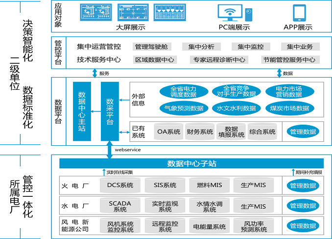 基于二级单位与所属电厂的分级安全生产和经营管控需求,建设集运营管控与技术服务于一体的智慧中心,实时采集和整合业务数据,动态分析和控制生产经营活动,深度挖掘和辅助运营决策,实现二级单位对电厂的实时监视,统一管控和资源共享,完成从规范流程到分析决策的跨越。