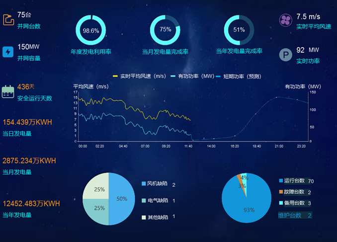 缩进在满足安防规定的条件下,获取各场站生产大区及管理信息大区的实时数据、非实时数据。以工艺图的方式展示区域生产单位设备的运行情况,包括设备参数的趋势查询、设备的状态显示,各场站的主接线图、风机机位分布图。支持可视化方式展示各场站单位的风资源、实时负荷、机组运行状态数量等实时数据。